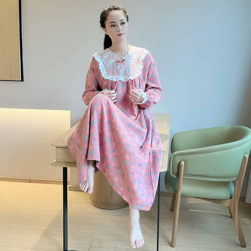甜美睡裙女春秋长款长袖棉纱孕妇宽松大码纯棉新款睡衣胖mm家居服