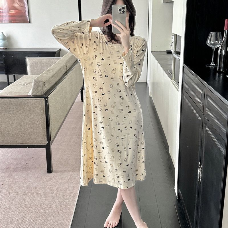 日系甜美睡裙宽松莫代尔棉睡衣女春秋长袖带胸垫超舒适外穿居家服