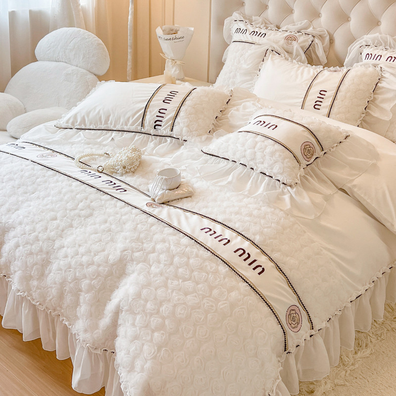 北欧轻奢全棉100纯棉白色四件套公主风荷叶边被套蕾丝网红床裙款4