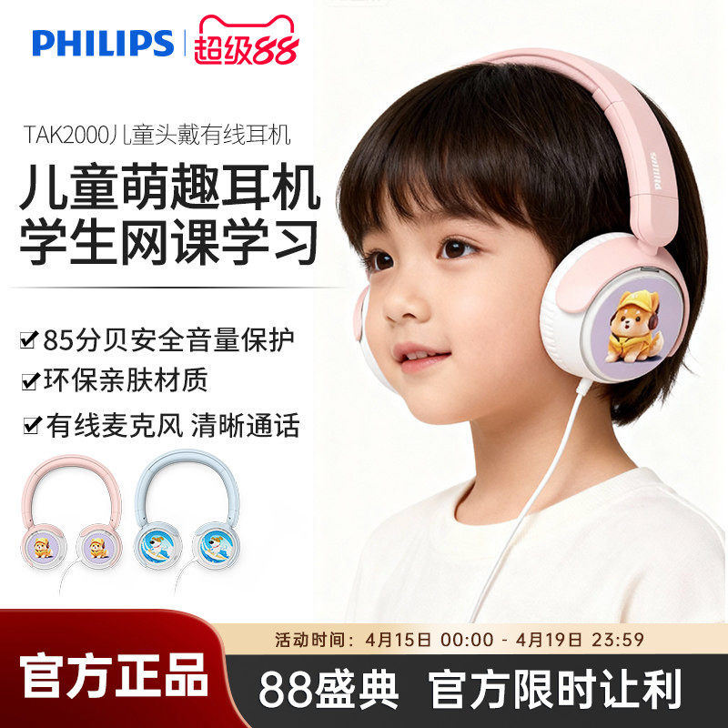 飞利浦TAK2000头戴式儿童听力小学生网课学习低分贝保护有线耳机
