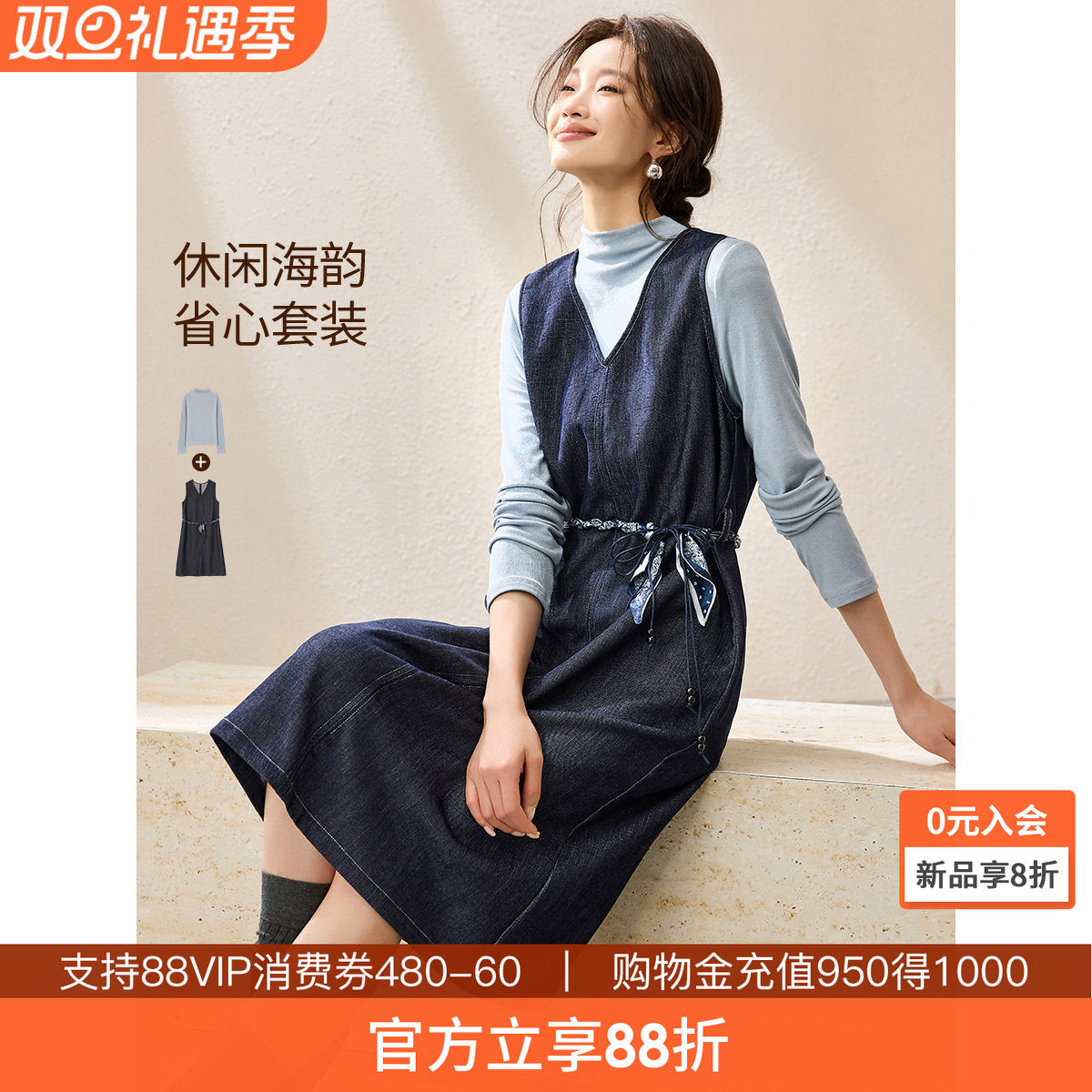 沫晗依美休闲撞色两件套2025冬季丝巾腰带装饰系带打底连衣裙套装