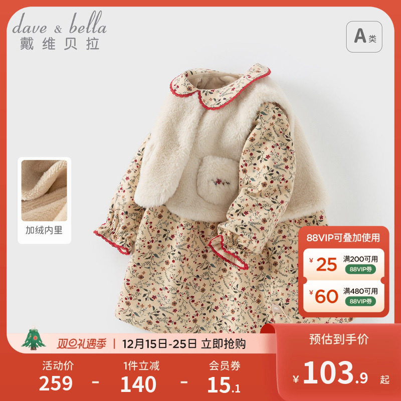 戴维贝拉儿童连衣裙套装冬装新款女童加绒碎花裙子背心两件套童装