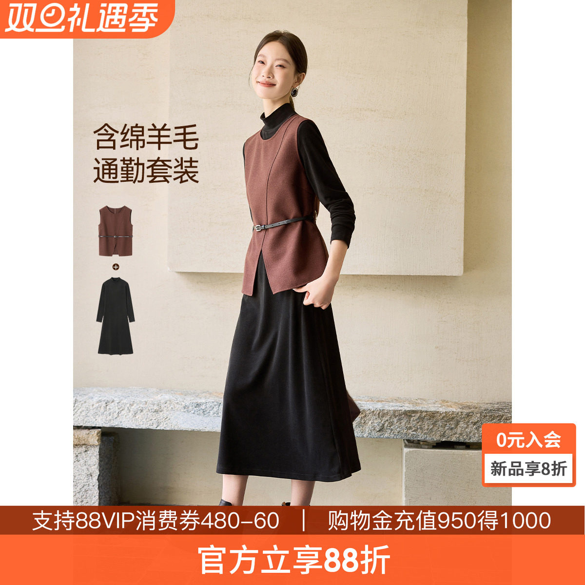 沫晗依美含羊毛气质两件套2025冬季通勤感保暖高领连衣裙马甲套装