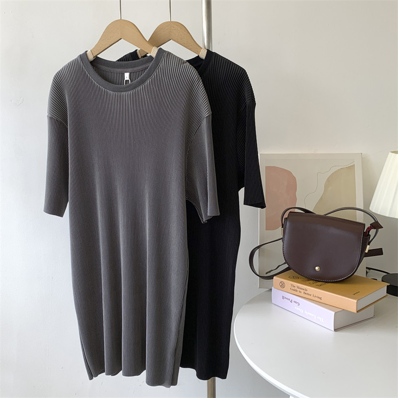 高温压皱褶皱设计圆领短袖连衣裙女高级深灰色宽松直筒裙短裙上衣