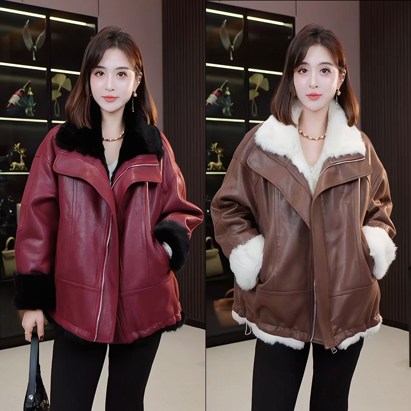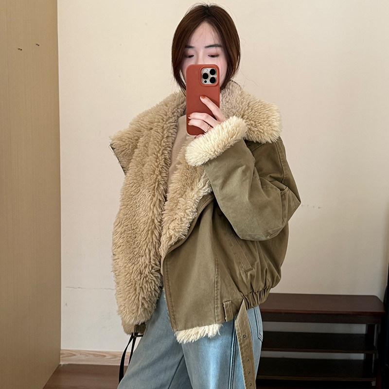 羊羔毛大翻领皮衣女士短款冬季新款加绒加厚保暖时尚夹克开衫外套