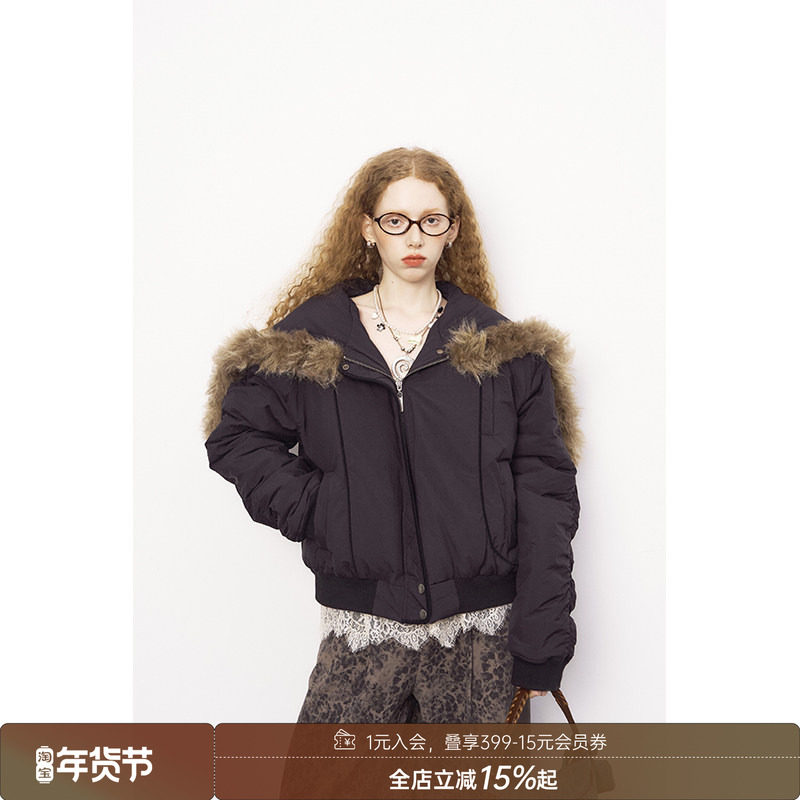 【清仓特惠】DIDDIMODA 大翻领连帽毛毛黑色短款棉服女冬季外套