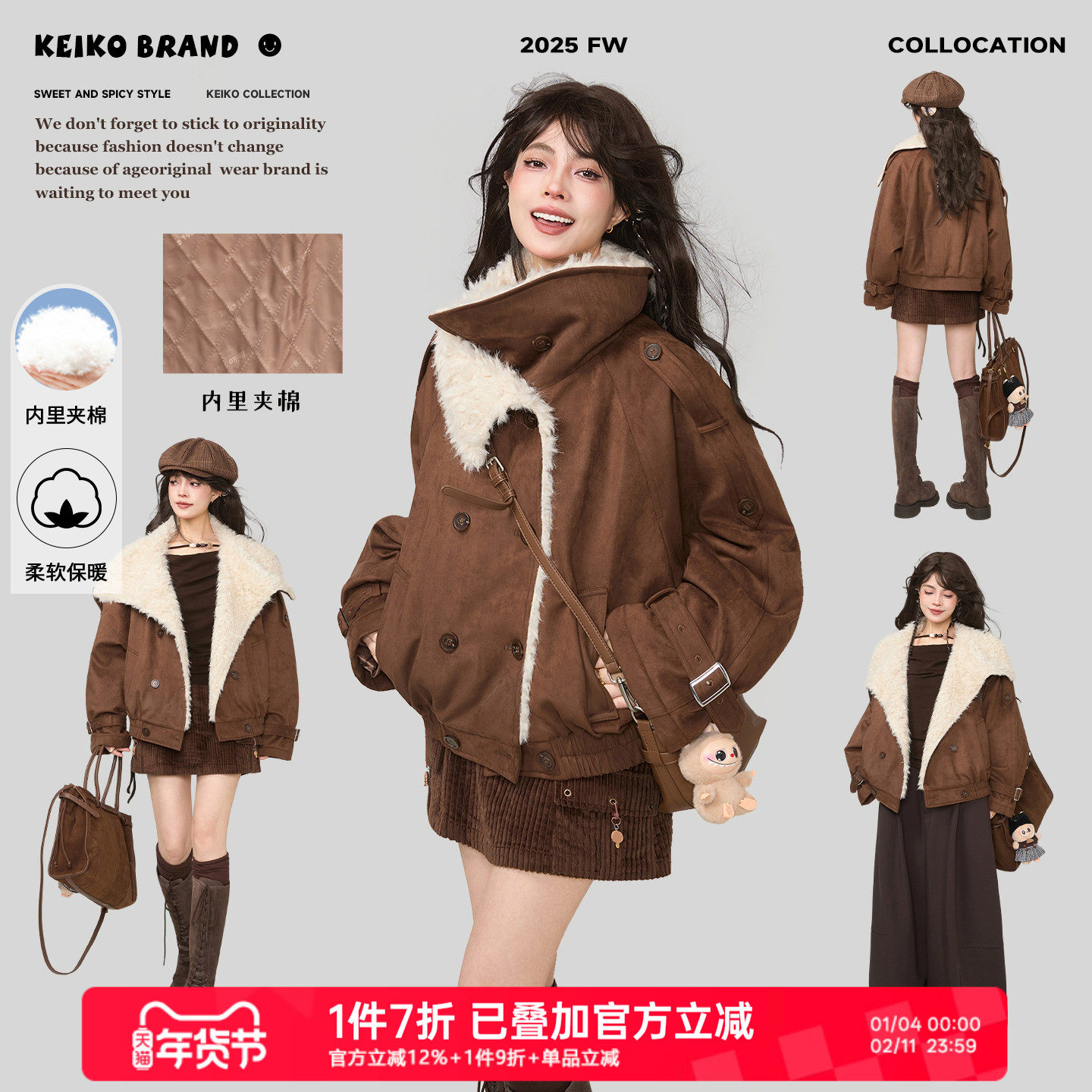KEIKO 环保牛皮绒大翻领夹棉外套女25冬季美拉德廓形加厚短款棉服