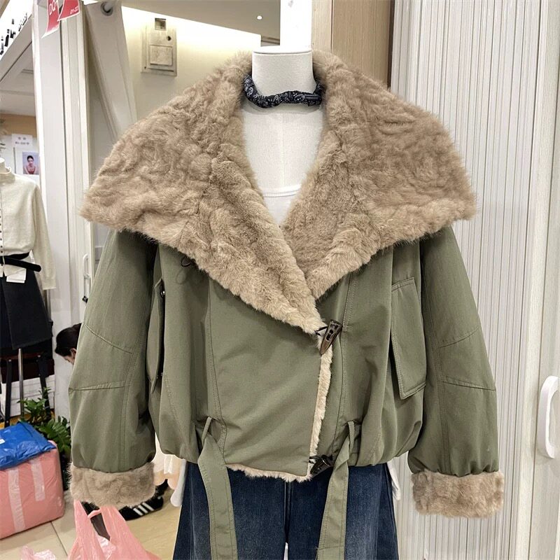 dfvc仿羊羔毛大翻领短款羽绒服女2025冬新款白鸭绒保暖外套派克服