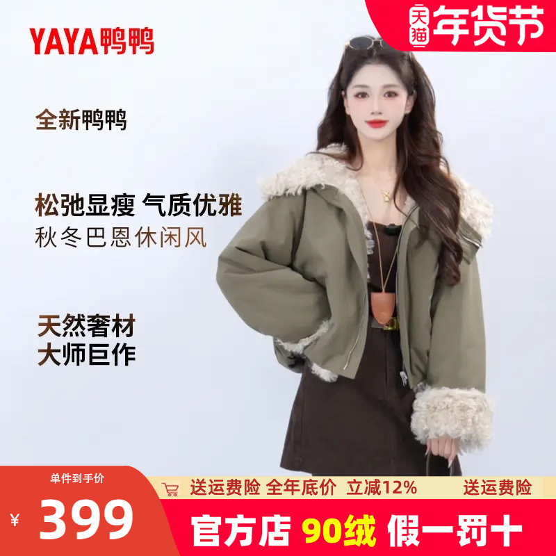 矢悦2025冬季短款羊羔毛拼接大翻领排骨款90白鸭绒羽绒服外套女