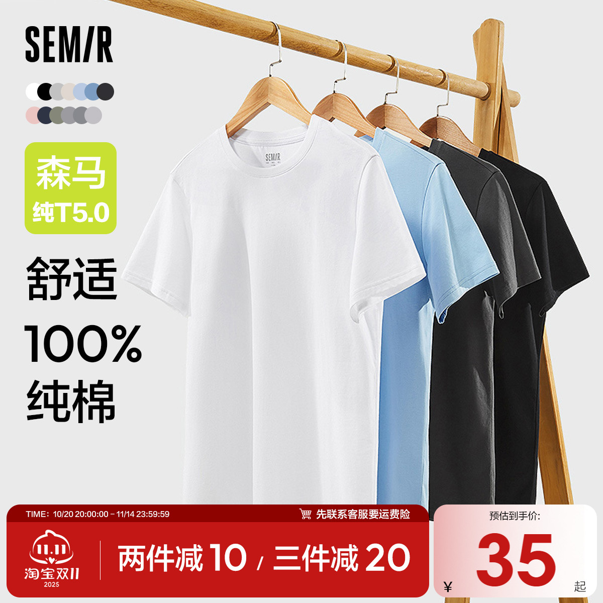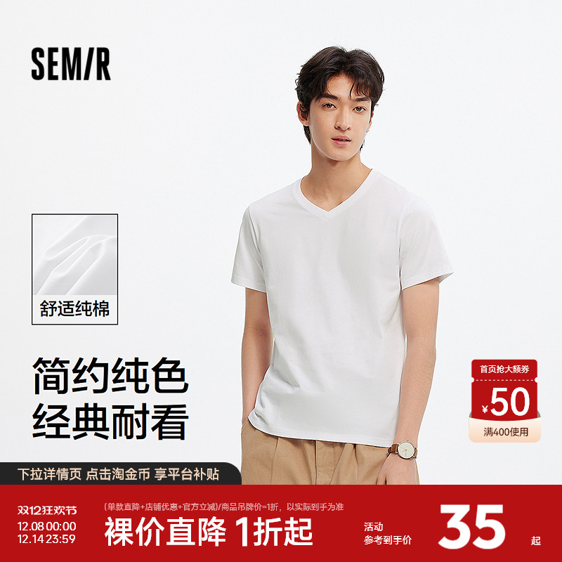 森马短袖T恤男修身纯色内搭纯棉2025夏季新款V领白t简约百搭上衣