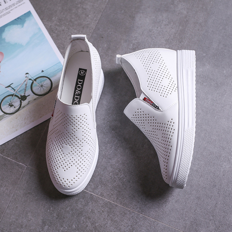 坡跟内增高小白鞋透气小个子6CM打孔镂空单鞋女乐福鞋白色护士鞋