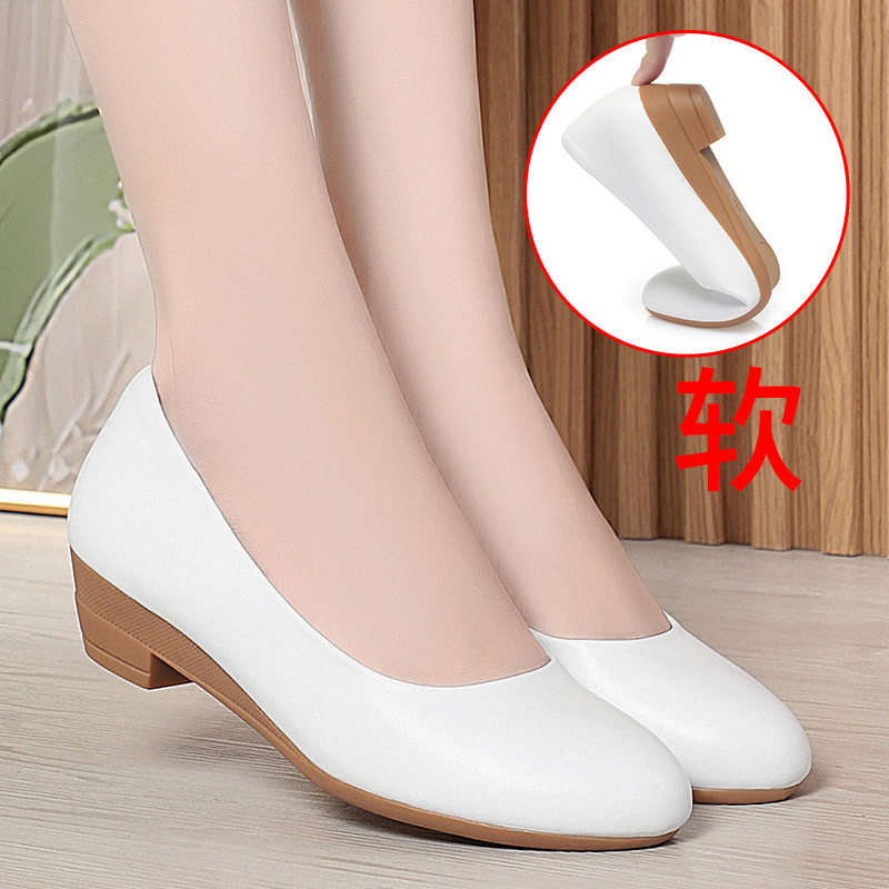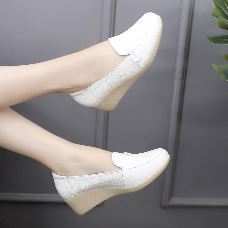 真皮白色护士工作鞋皮鞋女单鞋浅口坡跟软底女鞋中年妈妈鞋子瓢鞋