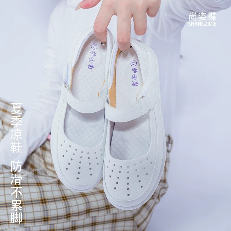 一字牌护士鞋女夏季白色坡跟美容网鞋镂空透气凉鞋防臭平底小白鞋