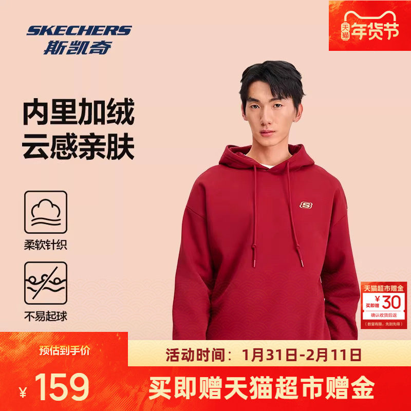 斯凯奇新年款连帽红色卫衣2026春季男女加绒保暖百搭运动针织上衣