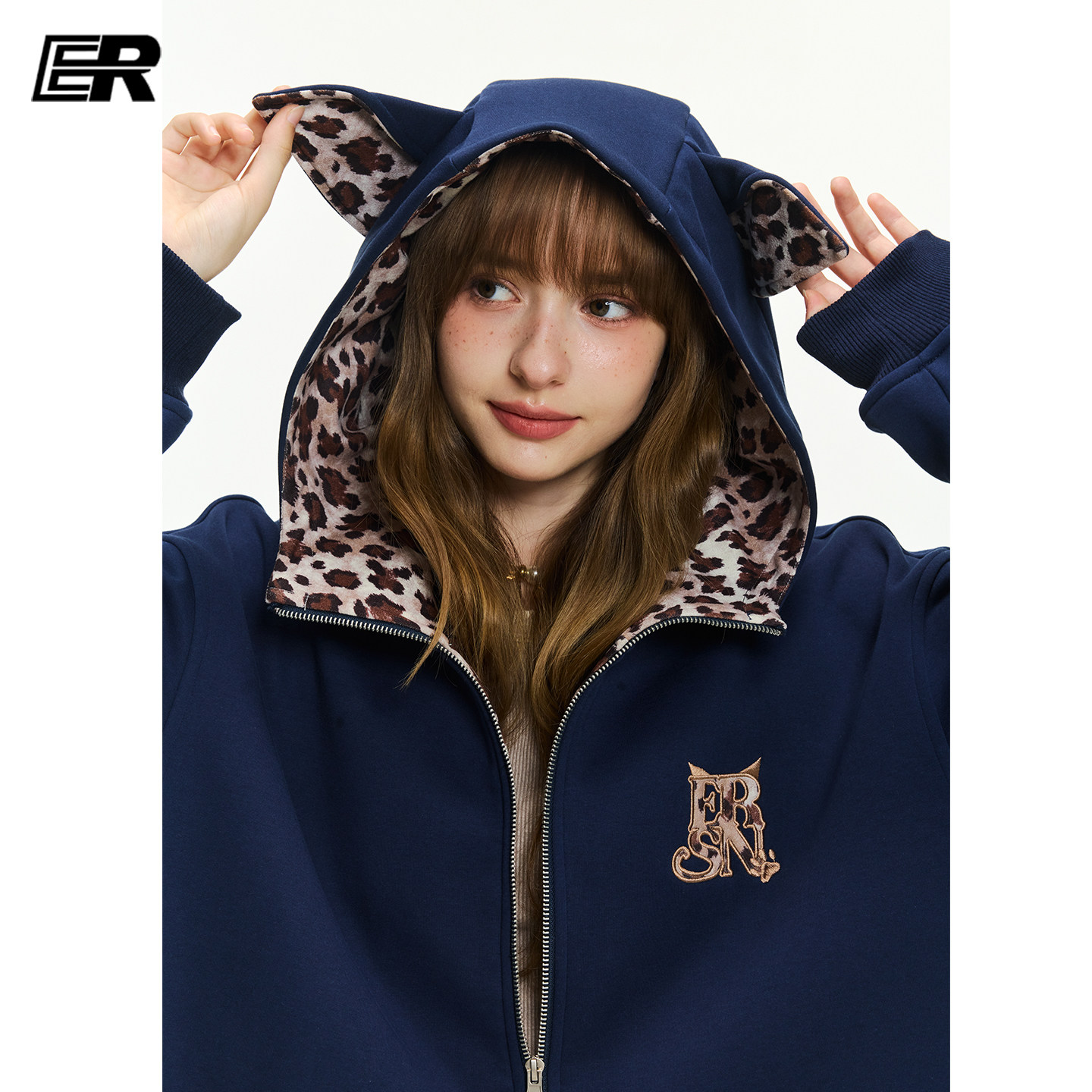 ER豹纹小狗耳朵连帽开衫加绒卫衣男2026秋冬街头风刺绣小高领外套