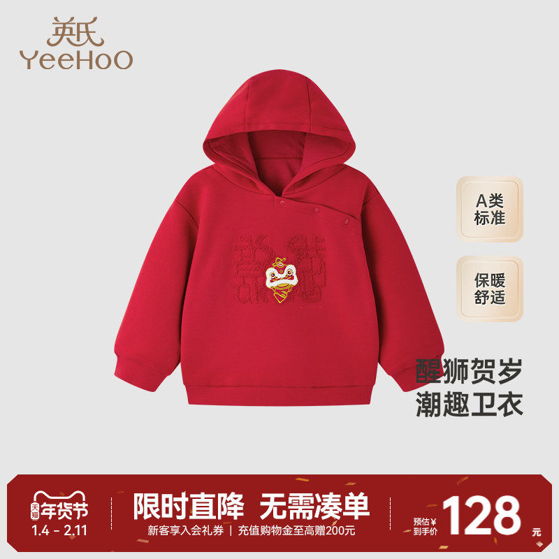 英氏儿童连帽卫衣春春秋加绒男童女童喜庆拜年服新年红色本命春季