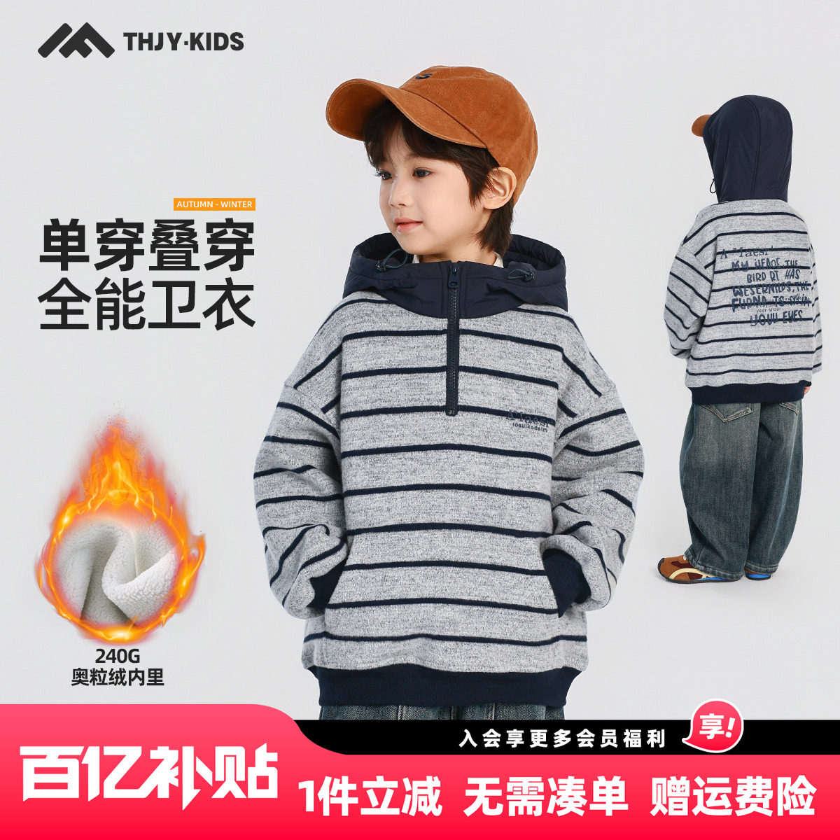 男童加绒卫衣2025秋冬新款儿童加绒加厚一体绒连帽条纹上衣冬装