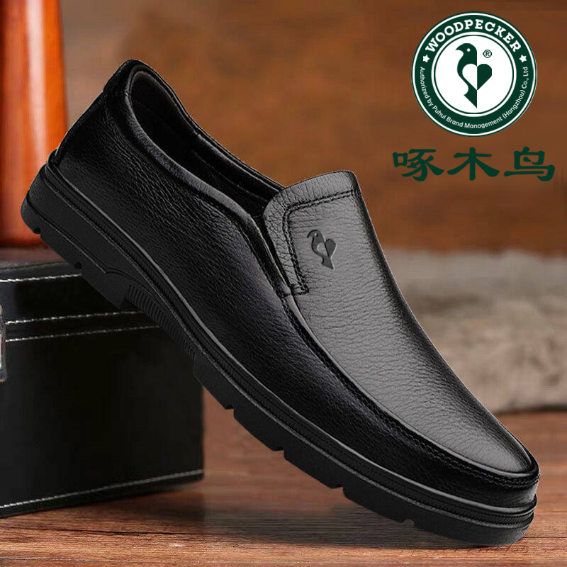 啄木鸟秋冬新款男皮鞋真牛皮厚底加绒休闲皮鞋软底一脚蹬爸爸鞋子