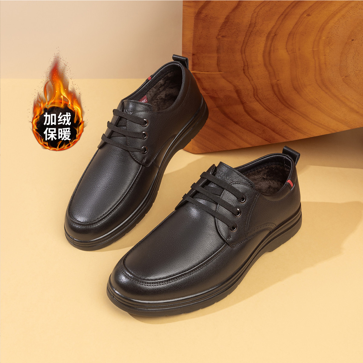 梦特娇皮鞋2025秋冬新款加厚加绒休闲皮鞋头层皮透气中老年爸爸鞋