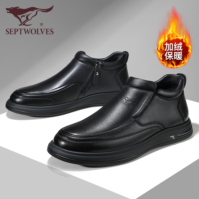 七匹狼棉鞋男款加绒休闲皮鞋秋冬防滑加厚爸爸保暖鞋黑色真皮男鞋