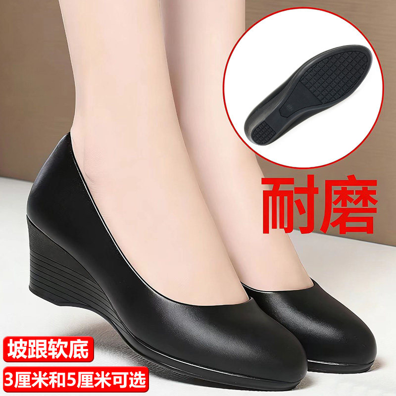 真皮坡跟浅口单鞋女软底防滑酒店前台职业鞋久站不累脚舒适妈妈鞋