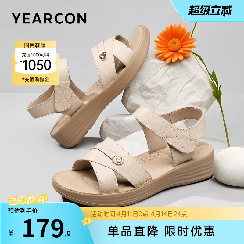 意尔康女鞋女士夏天真皮舒适坡跟妈妈凉鞋软底外穿中老年母亲老人