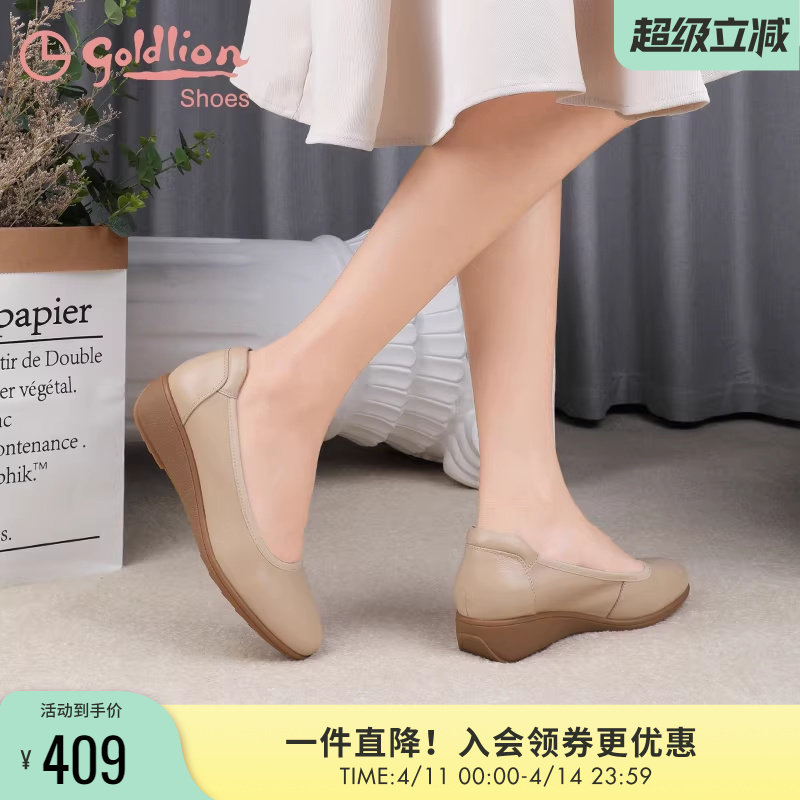 金利来舒适坡跟女鞋真皮圆头休闲通勤工作皮鞋浅口一脚蹬妈妈单鞋
