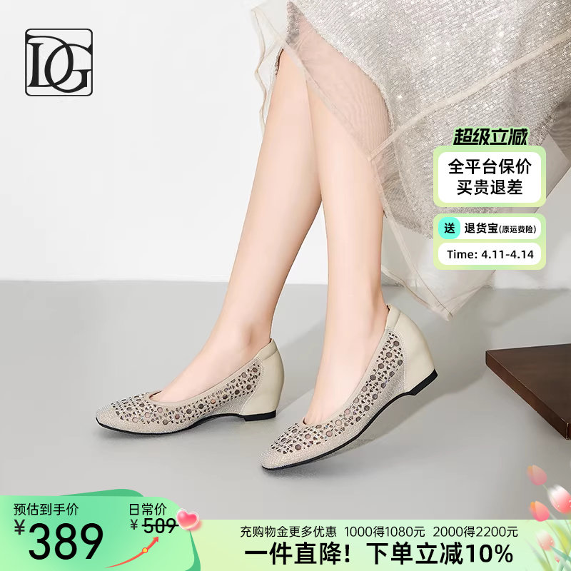 【商场同款】镂空网纱浅口单鞋女2026春季新款坡跟透气水钻妈妈鞋