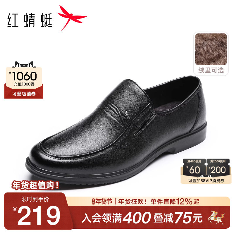红蜻蜓男鞋秋冬加绒鞋子男士一脚蹬商务正装皮鞋男牛皮爸爸鞋真皮
