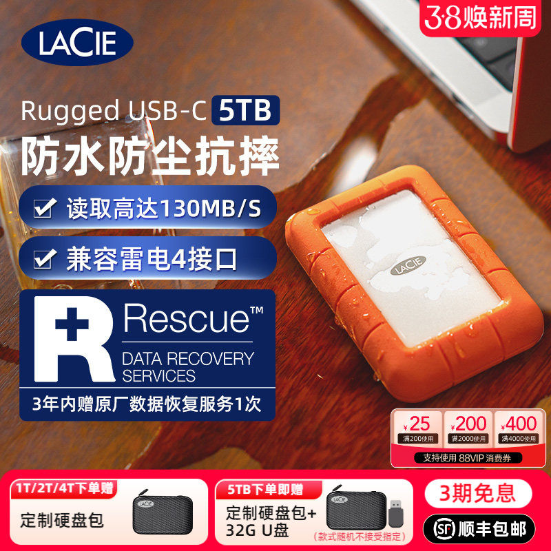 雷孜LaCie移动硬盘5t高速TypeC接口雷电4t机械1t外接2t大容量莱斯