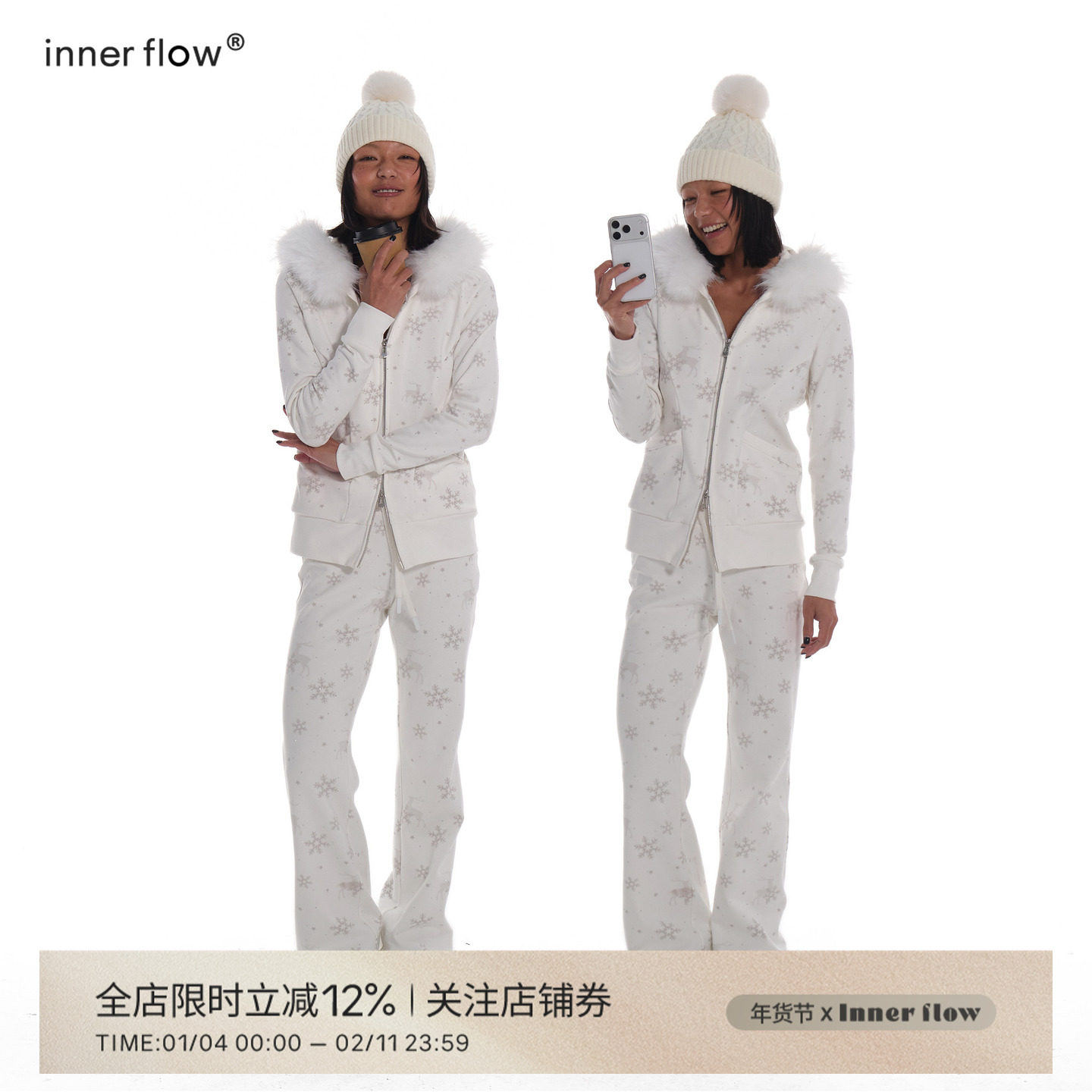 INNERFLOW白谧私语 白色加绒烫钻毛毛卫衣外套+印花休闲卫裤套装