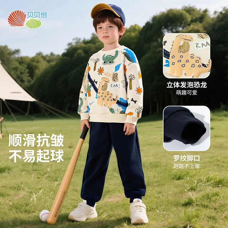 贝贝怡童装春秋新款男童恐龙卡通印花卫衣套装儿童休闲运动2件套