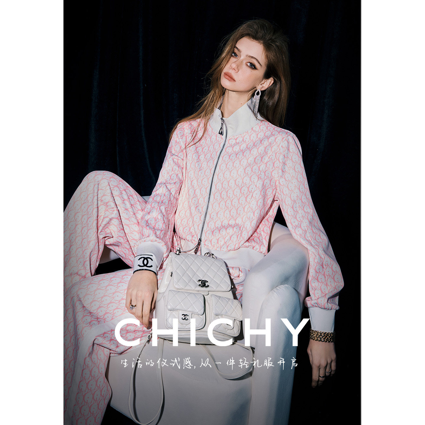 CHICHY法式休闲印花卫衣套装女26春季新款粉色显瘦上衣长裤两件套