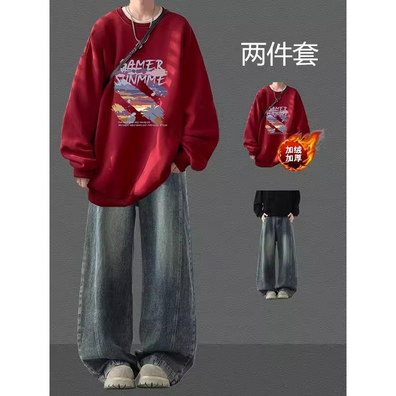 潮牌印花卫衣套装男生酷帅气秋冬加绒酒红上衣初高中生穿搭两件套