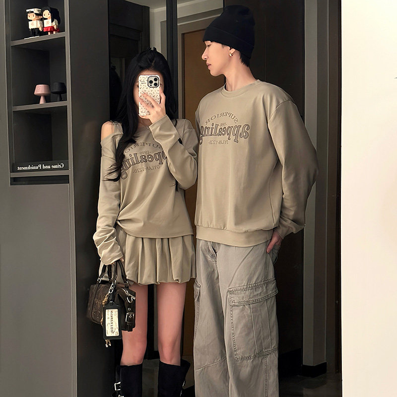 情侣装美式复古斜肩字母印花卫衣套装2026春季百搭宽松圆领上衣潮
