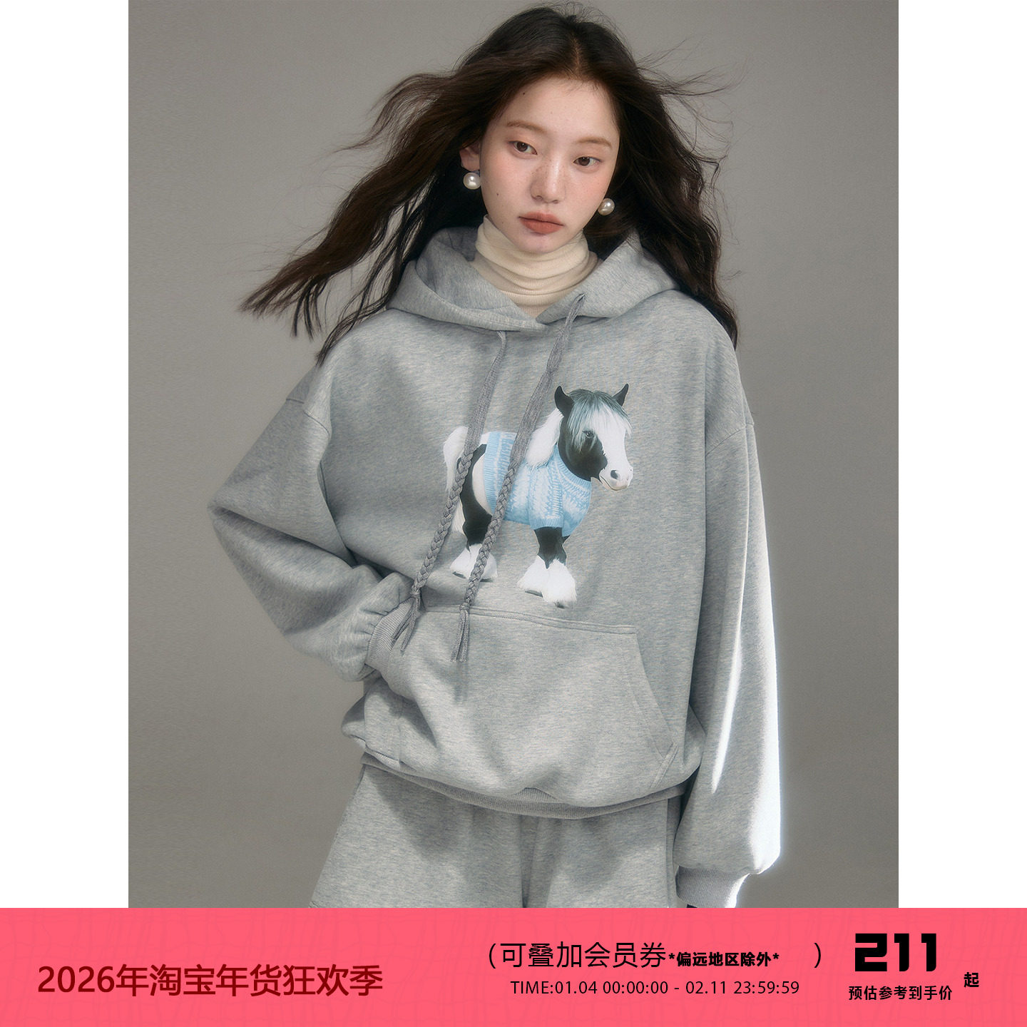 有耳uare原创设计 pony club 小马印花加绒连帽卫衣短裤套装