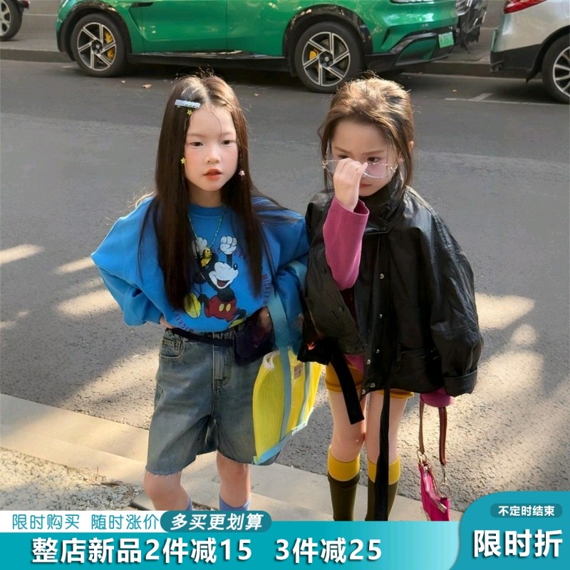 韩国卡通米奇印花卫衣套装女童休闲百搭长袖纯棉T恤上衣牛仔短裤t