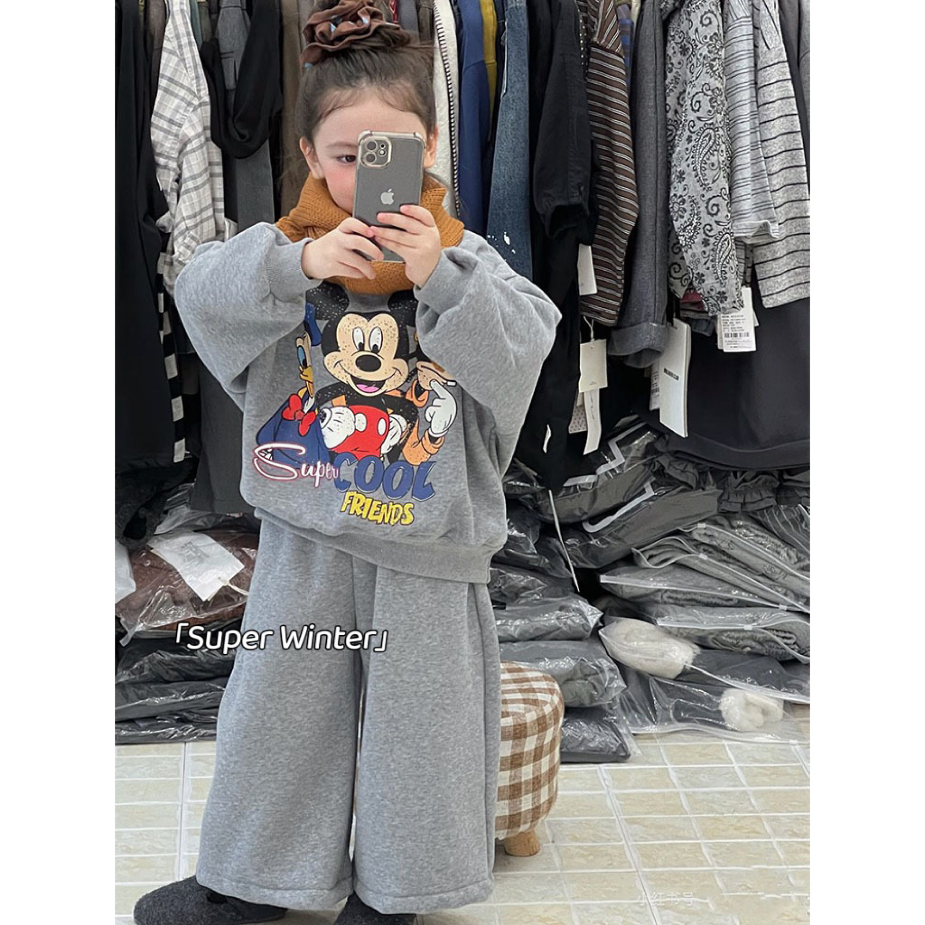 女童冬季新款韩版可爱卡通米奇印花卫衣套装加厚羊羔绒休闲两件套