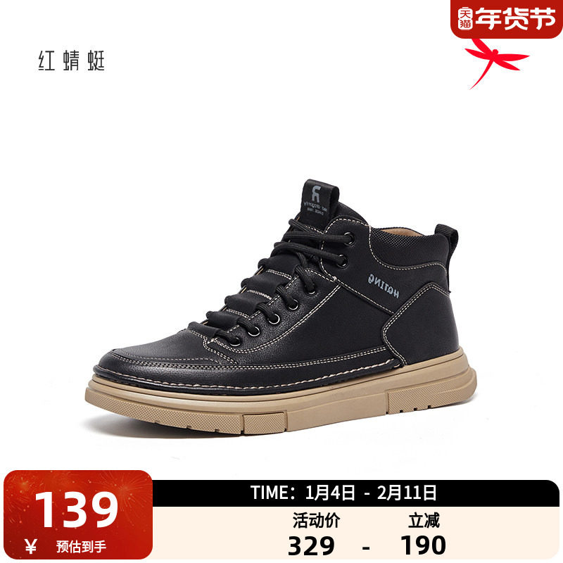 红蜻蜓休闲工装板鞋秋冬新款男鞋平底系带高帮鞋通勤小白板鞋皮鞋