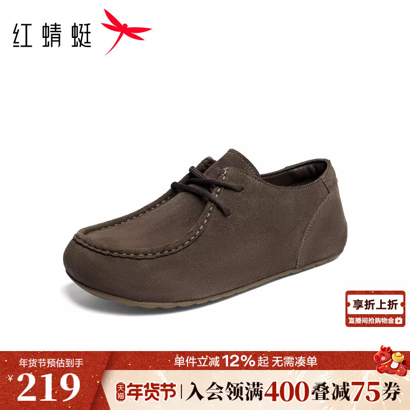 红蜻蜓勃肯鞋2026春季新款男鞋平底时尚系带真皮皮鞋牛津袋鼠鞋男