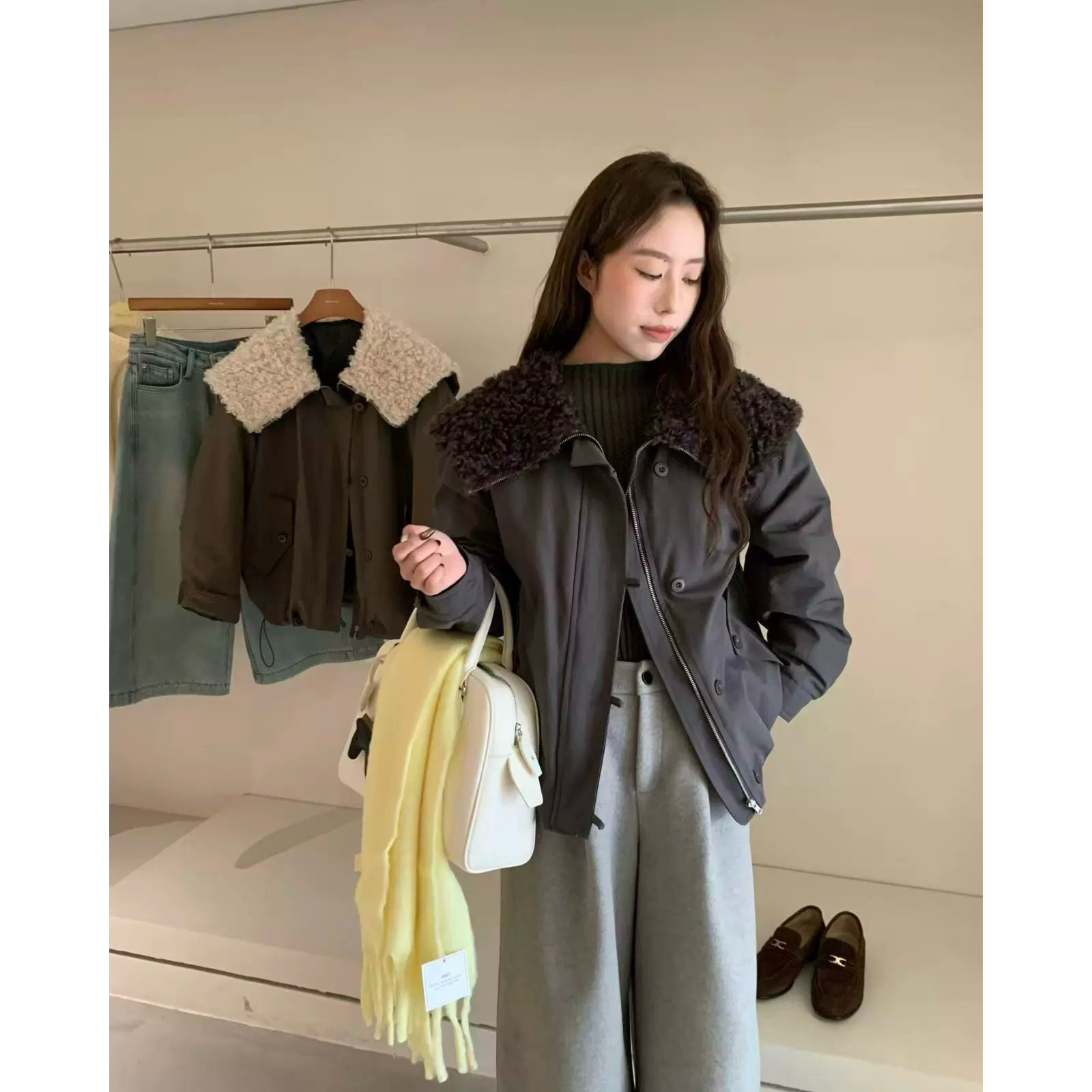 韩国25冬款脱卸羊羔毛毛翻领抽绳收腰大口袋韩版工装羽绒服35909