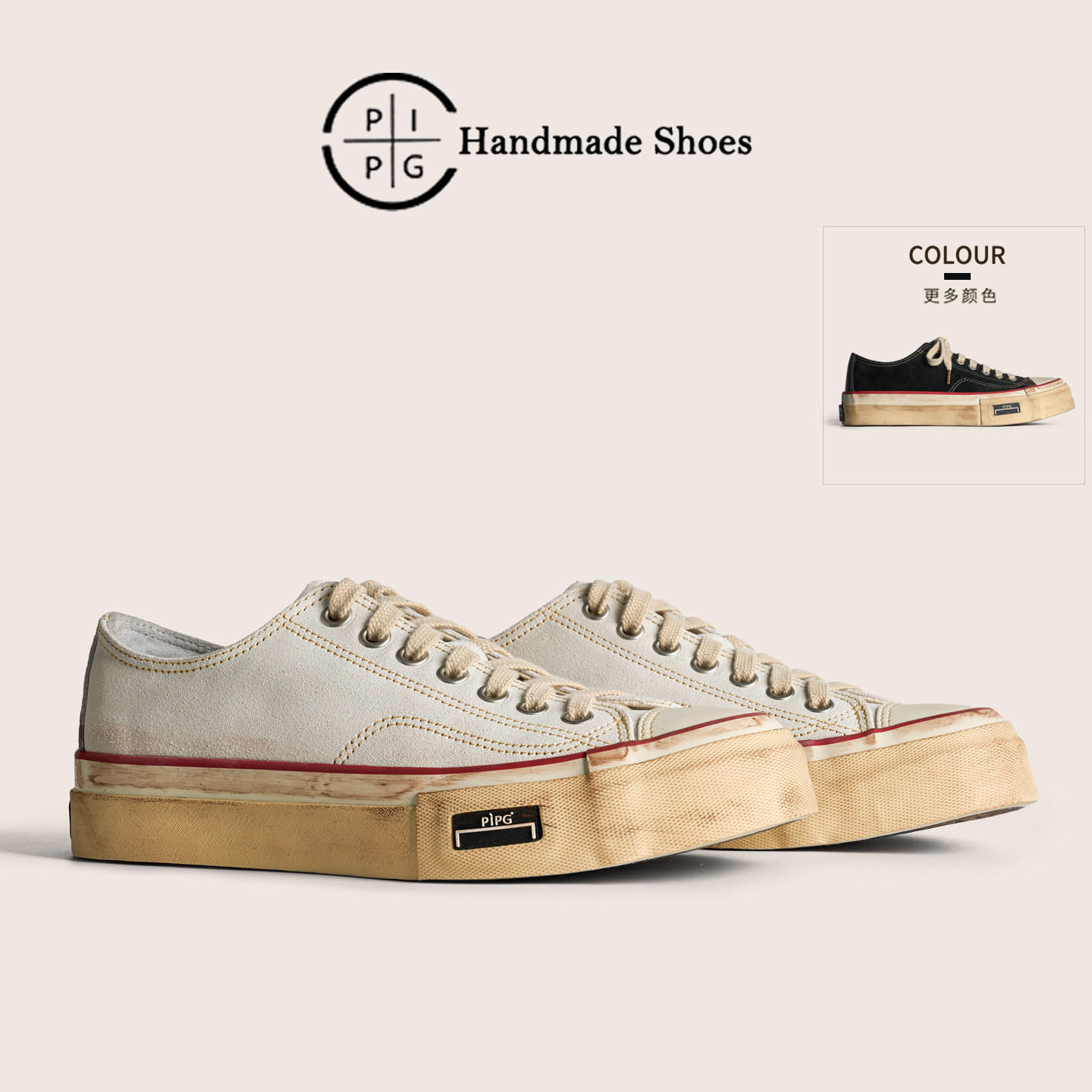 PIPG男女款复古做旧擦色反绒牛皮帆布鞋 厚底硫化鞋手工休闲板鞋