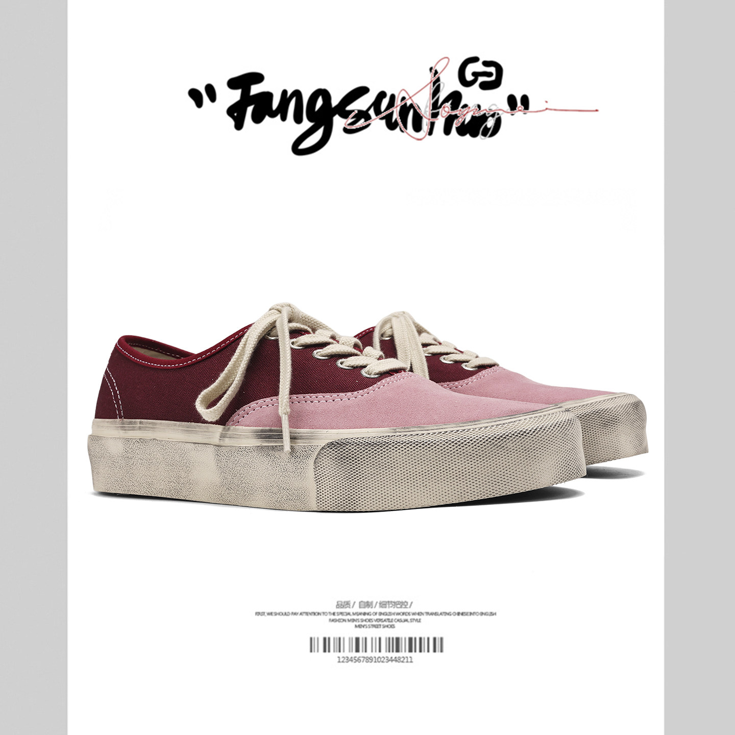 方三火 春季日系透气低帮帆布鞋男厚底做旧复古粉色休闲滑板鞋男