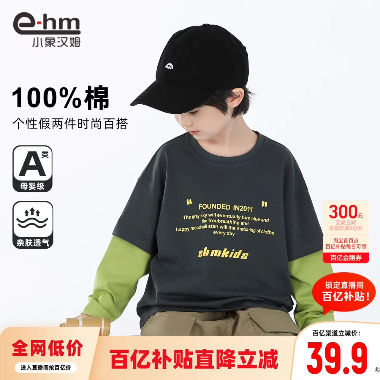 小象汉姆童装男童长袖T恤假两件儿童纯棉打底衫2026春装新款上衣
