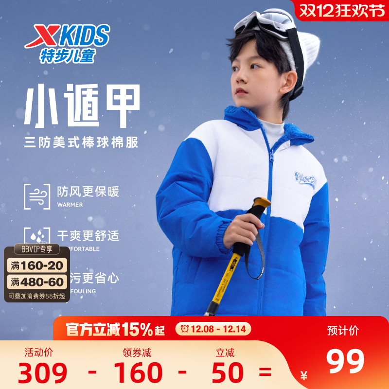 特步童装男童两面穿外套2025秋冬新款儿童保暖棉服中大童三防秋装