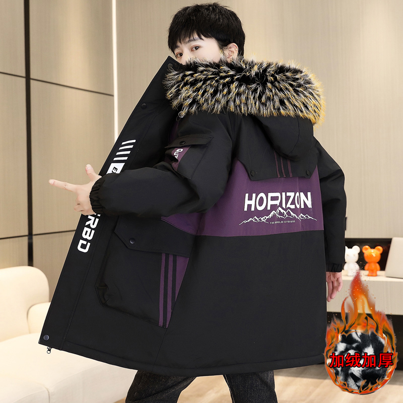 中长款派克棉服男青少年加绒加厚外套男冬季潮流帅气休闲大衣棉服