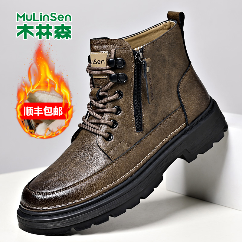 木林森男鞋高帮皮鞋2025冬季新款复古时尚潮流真皮马丁靴男工装靴