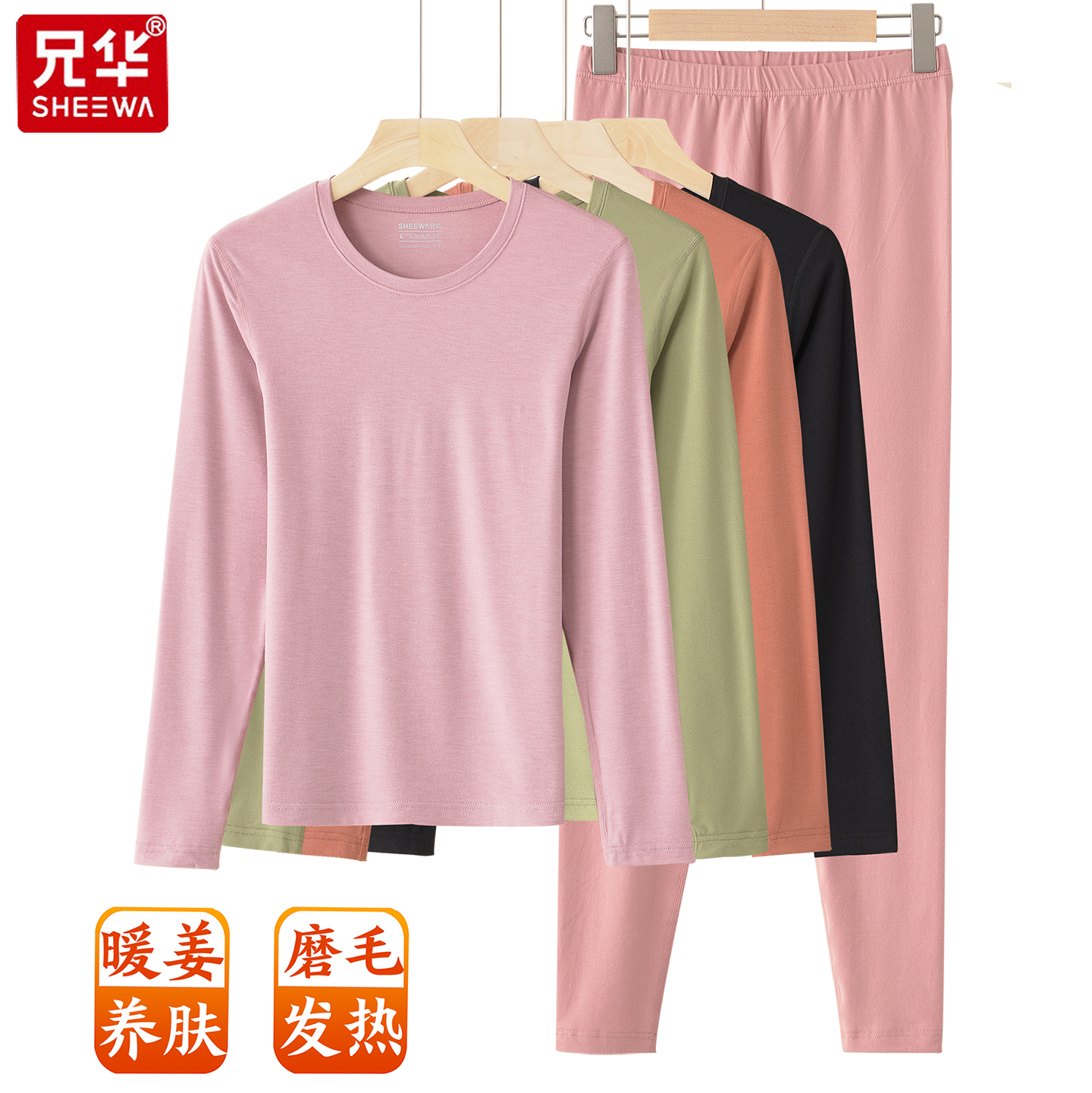 兄华女士圆领秋衣秋裤套装薄款蚕丝发热修身打底保暖内衣58330冬