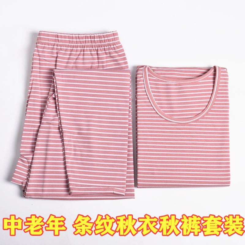 女士圆领秋衣秋裤套装莱卡棉条纹老人棉毛衫全棉宽松保暖内衣打底