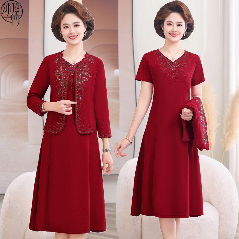 2021春装中年妈妈富贵开衫外披连衣裙 加大码阔太太过膝连衣裙